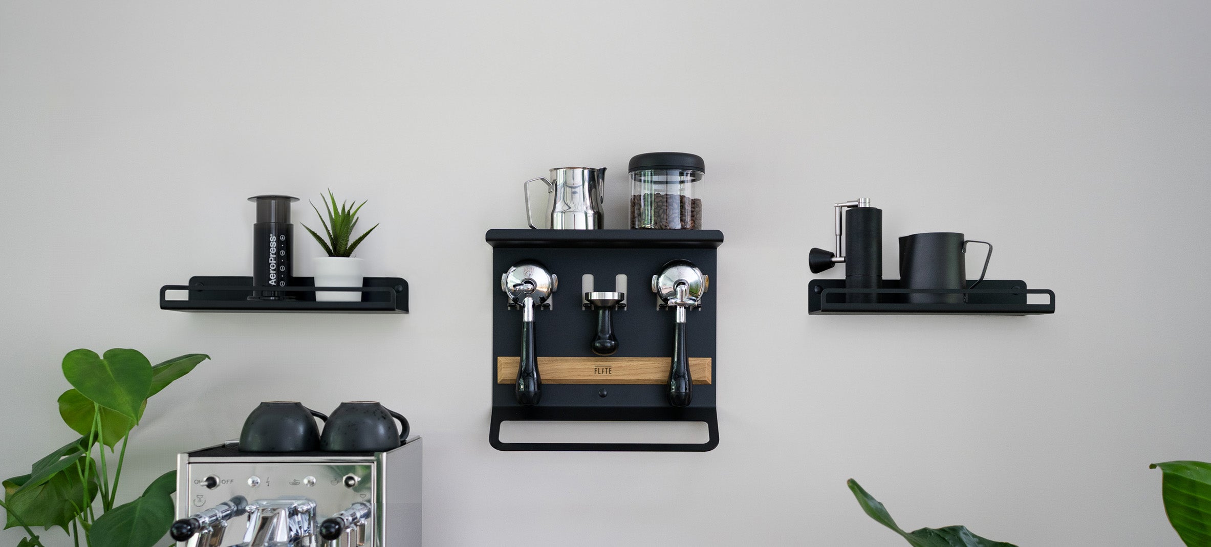 Die FLATE® Barista Regale bringen Ordnung in deine Kaffeebar, egal welche Maschine du besitzt oder wie viel Platz du hast. In zwei verschiedenen Größen findest du die passenden Halterungen und Ablage-Möglichkeiten, die du benötigst.