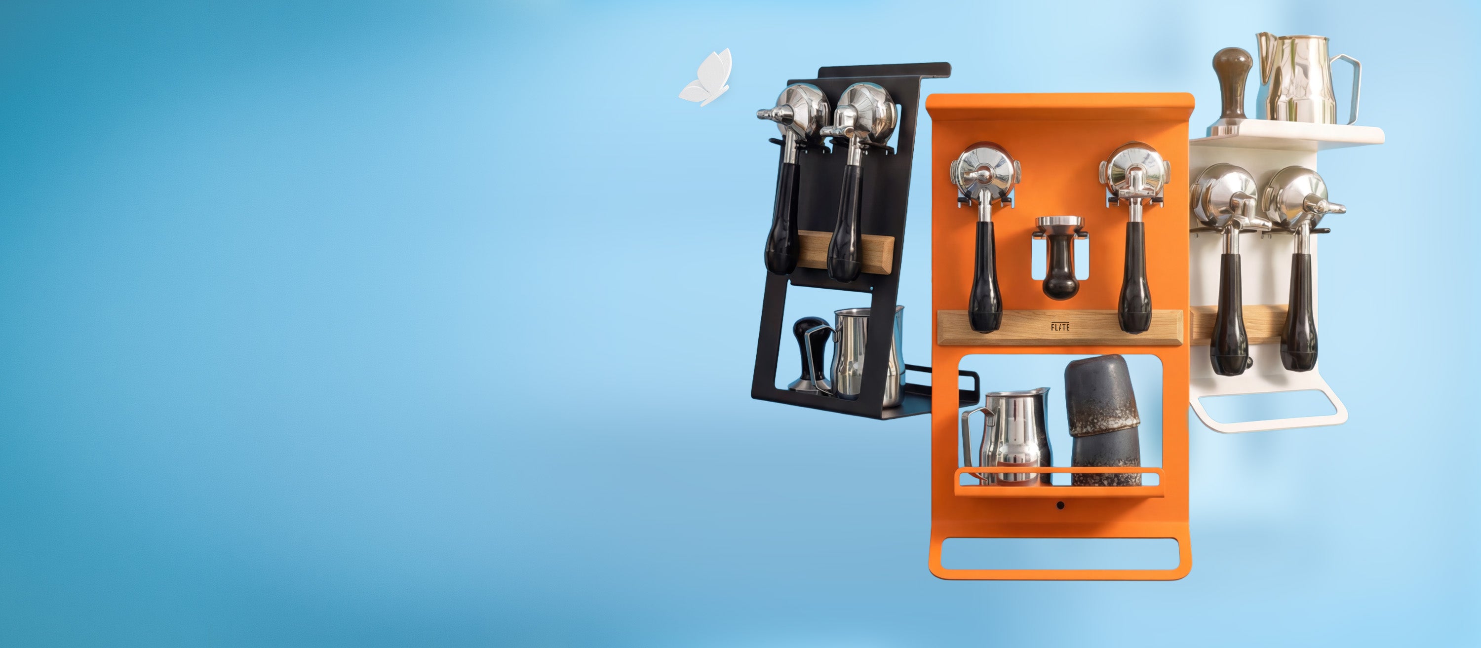Die FLATE® Barista Regale bringen Ordnung in deine Kaffeebar, egal welche Maschine du besitzt oder wie viel Platz du hast. In zwei verschiedenen Größen findest du die passenden Halterungen und Ablage-Möglichkeiten, die du benötigst.