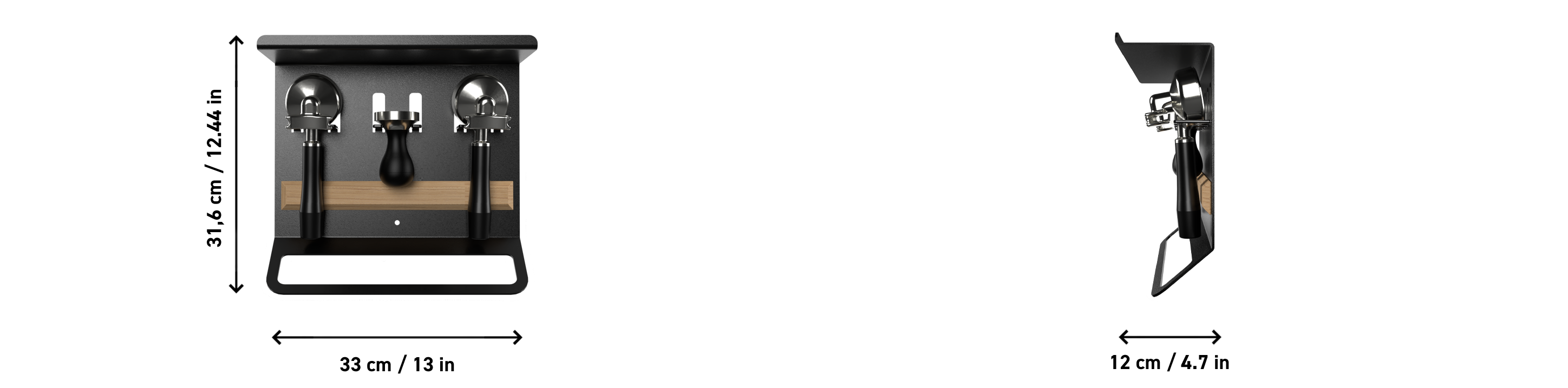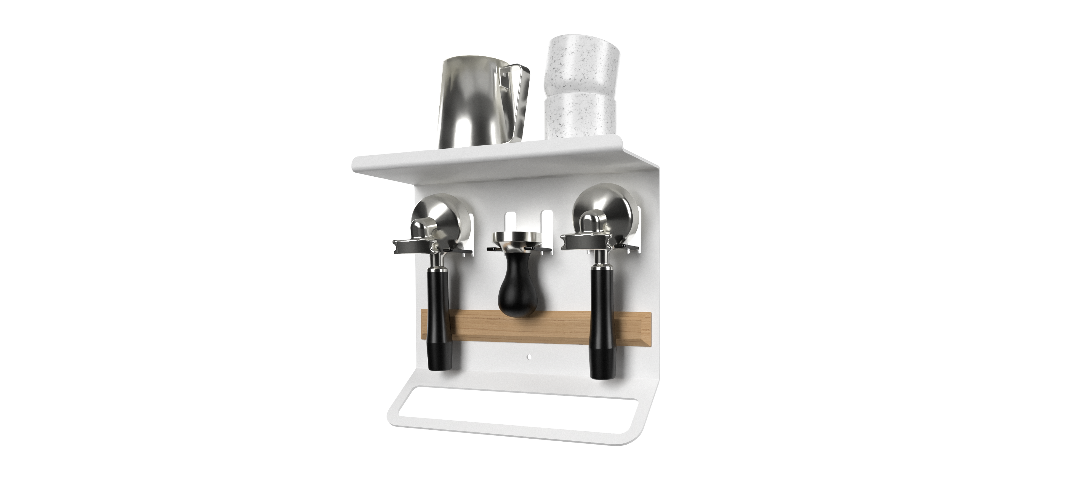Das FLATE® Barista Board ist aus robustem, pulverbeschichtetem Stahl gefertigt und bietet verschiedene Organisationsmöglichkeiten: Mit drei Halterungen für Siebträger oder Tamper, einer großzügigen Ablagefläche für zusätzliche Barista-Tools wie Waagen oder Bohnenbehälter, und einer Hängevorrichtung für Barista-Tücher oder Kännchen.