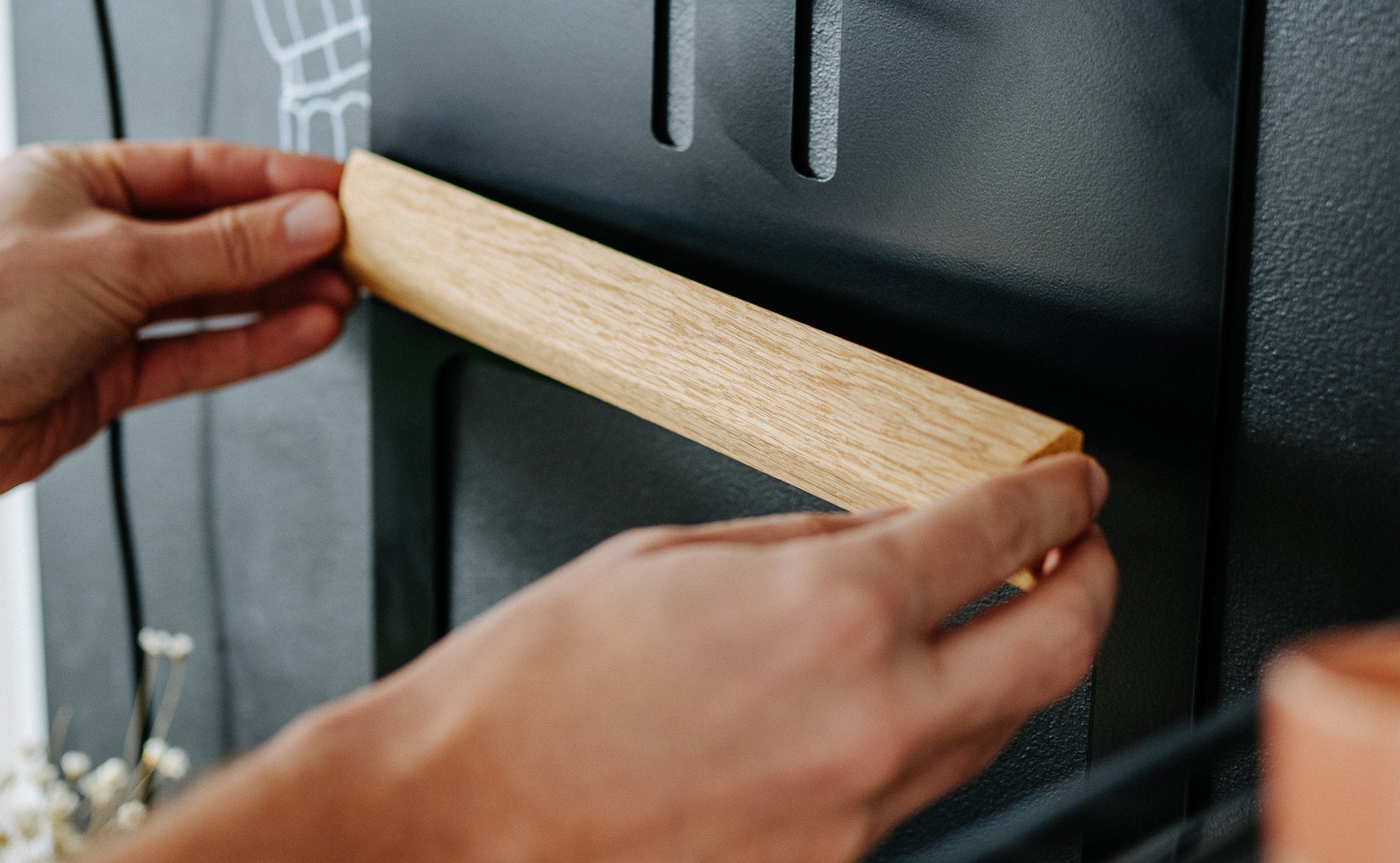 Montiere das Regal einfach und sicher mit den beigelegten Dübeln und Schrauben an der Wand. Die magnetische Holzleiste kann an der gewünschten Stelle platziert werden.